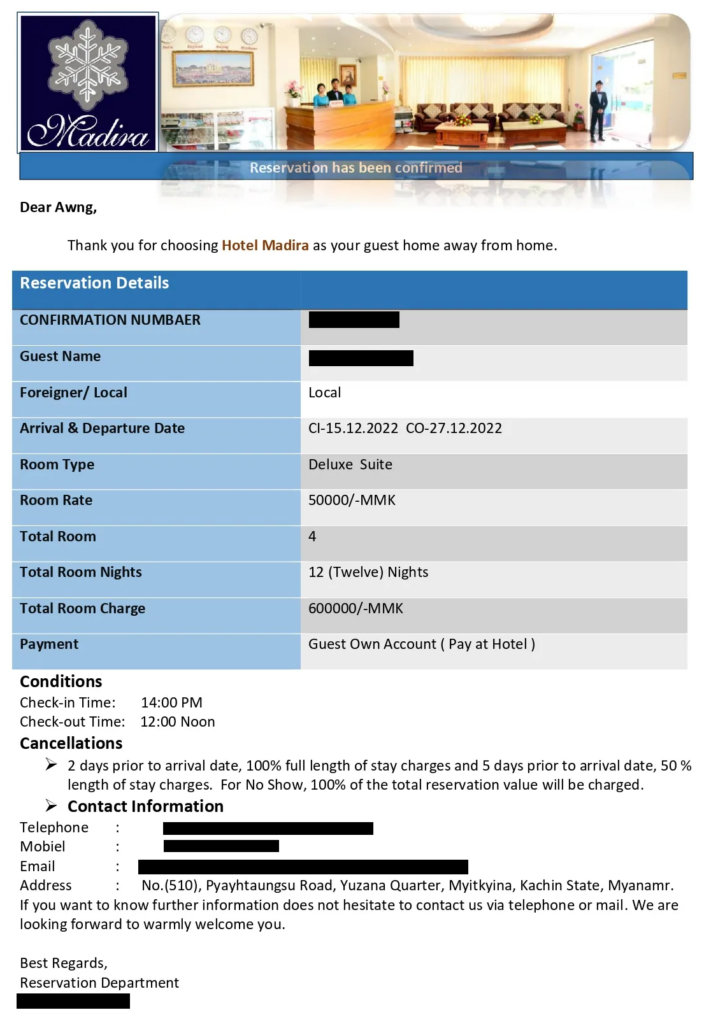 হোটেল বুকিং এর প্রমাণ আবেদনের সাথে সংযুক্ত করতে হবে। মিয়ানমারে থাকার সময় পর্যটকদের অবশ্যই নিবন্ধিত হোটেল, মোটেল, ইনস, গেস্ট হাউস এবং রিসোর্টে থাকতে হবে। আপনাকে অবশ্যই হোটেল বুকিং নিশ্চিতকরণের একটি আসল কপি আপলোড করতে হবে যাতে পিডিএফ ফরম্যাটে অতিথির নাম অন্তর্ভুক্ত থাকে। হোটেলের নামের অফিসিয়াল লেটারহেডে দেওয়া আসল হোটেল বুকিং নিশ্চিতকরণের কপি।