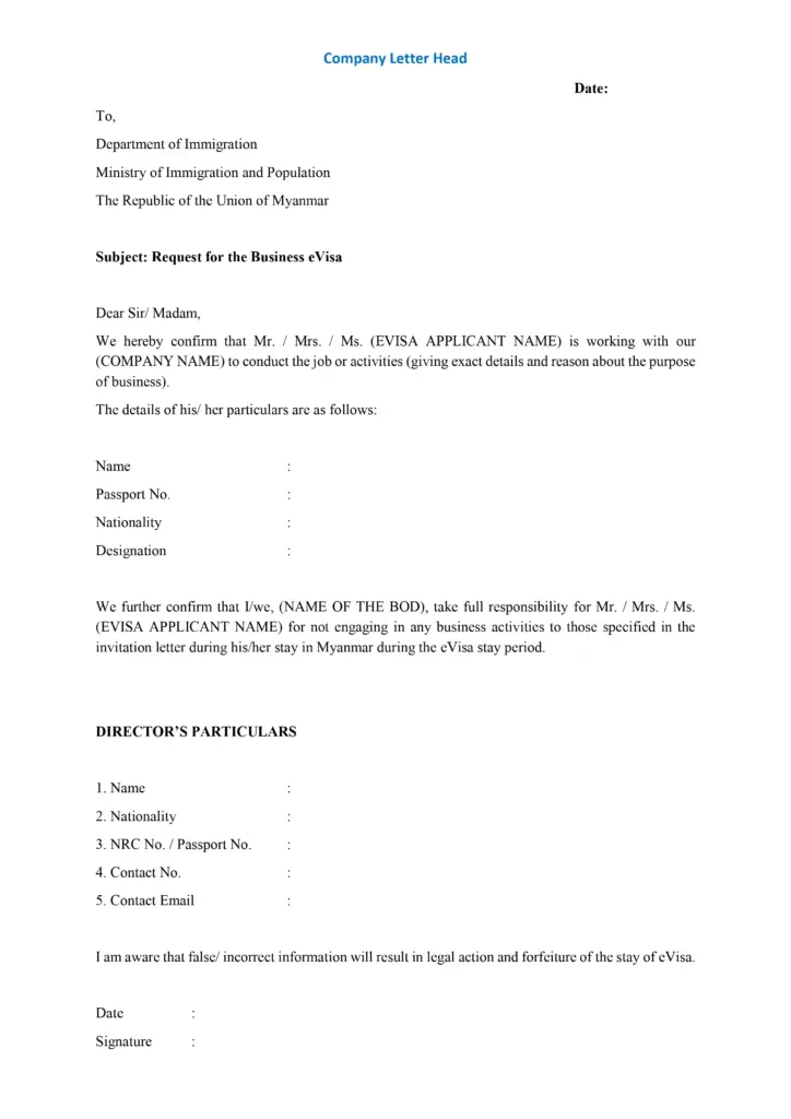 • অনুগ্রহ করে মনে রাখবেন: মায়ানমার সরকারের eVisa শর্তাবলী অনুসারে, আমন্ত্রণ পত্রটি অবশ্যই আবেদনকারীকে নাম দিয়ে সম্বোধন করতে হবে এবং আমন্ত্রণ জানাতে হবে। (আপনার রেফারেন্সের জন্য আমন্ত্রণ পত্রের নমুনা নীচে দেওয়া হল।)